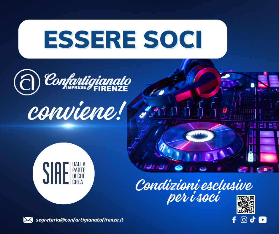 Sono attive anche per il 2026 le Convenzioni con SIAE – Società Italiana degli Autori ed Editori e con SCF, che consentono alle imprese associate a Confartigianato Imprese Firenze di usufruire di importanti riduzioni sui compensi dovuti per l’utilizzo di musica e video protetti da diritto d’autore nei locali in cui si svolge l’attività.